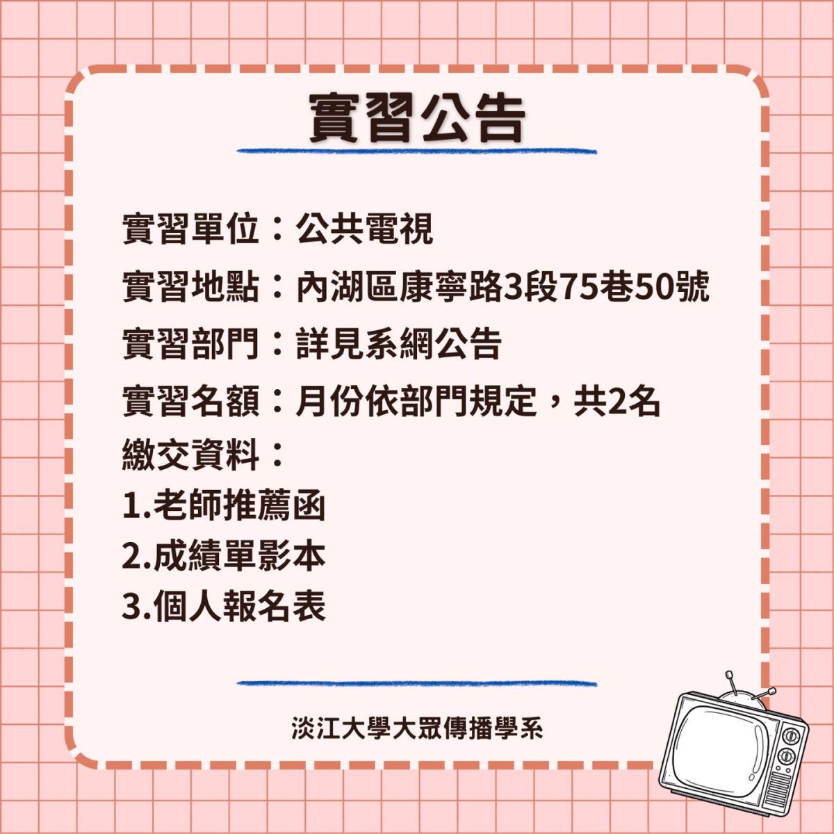 實習公告 一、實習單位:公共電視 二、實習地點:內湖區康寧路3段75巷50號 三、實習部門:詳見系網公告 四、實習名額:月份依部門規定,共2名 五、繳交資料︰ 1.老師推薦函 2.成績單影本 3.個人報名表(系網或活動官網下載,繳交時需Word檔與紙本一起交) 六、活動官網:https://www.pts.org.tw/student/ 七、有意參與「公共電視」實習徵選之同學,請於4/9 (四)中午12點前備妥申請資料,向影棚助教報名(請當面交給助教),逾時不受理 八、有任何疑問請洽(O101)影棚小玲助教