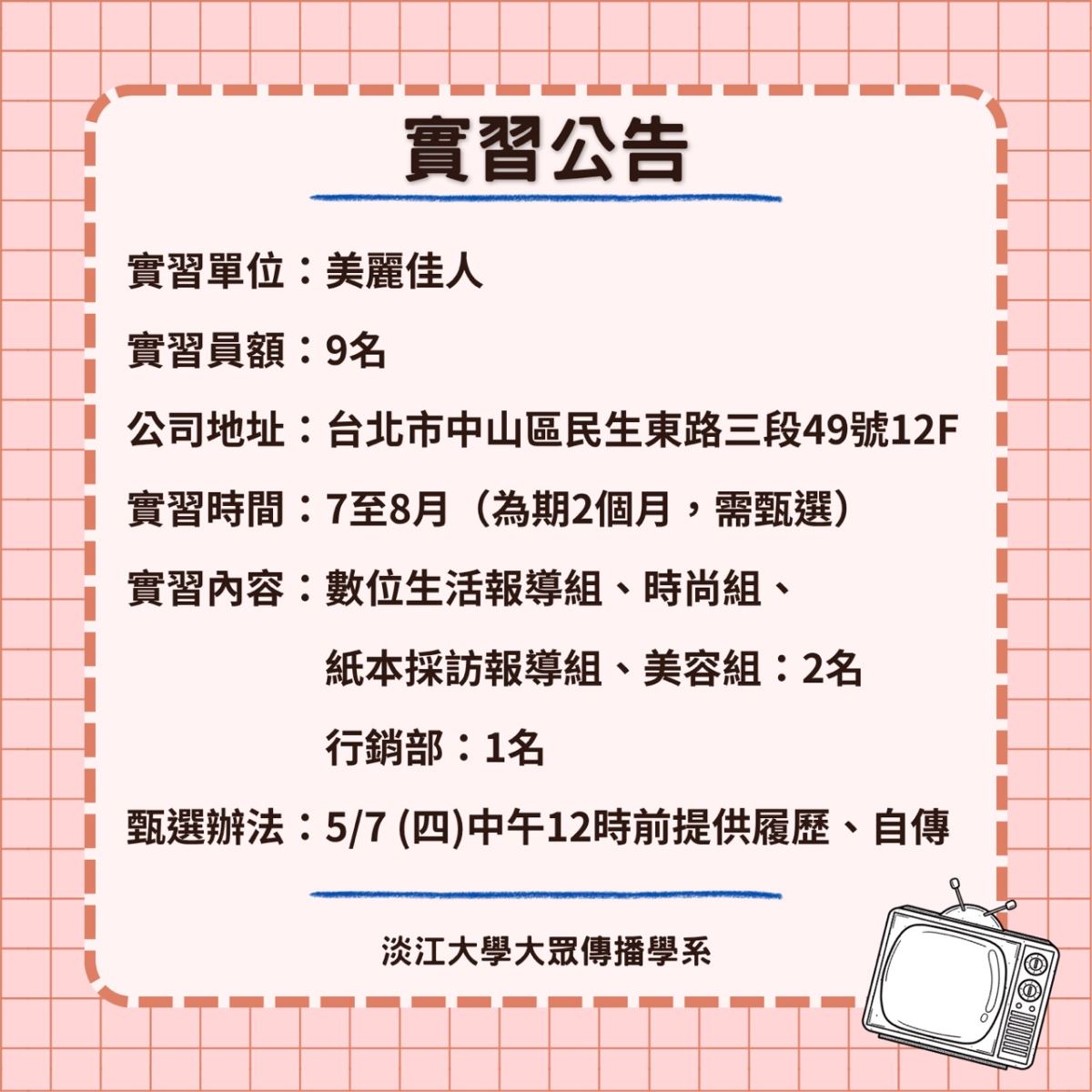 一、實習單位︰國際亞洲出版股份有限公司 (美麗佳人) 二、實習員額:9名 三、公司地址:台北市中山區民生東路三段49號12F 四、實習時間︰7至8月(為期2個月,需甄選) 五、工作時間:依各部門規定,可面談討論 六、實習內容:數位生活報導組:2名 時尚組:2名 紙本採訪報導組:2名 美容組:2名 行銷部:1名 (各組工作內容可參考附件) 七、實習生條件:詳附件 八、甄選辦法:5/7 (四)中午12時前提供履歷、自傳,並備註期望的部門排序,寄至164702@o365.tku.edu.tw 由助教統一寄出,逾期不候。 九、如有疑問請洽O301/O302偉捷助教。