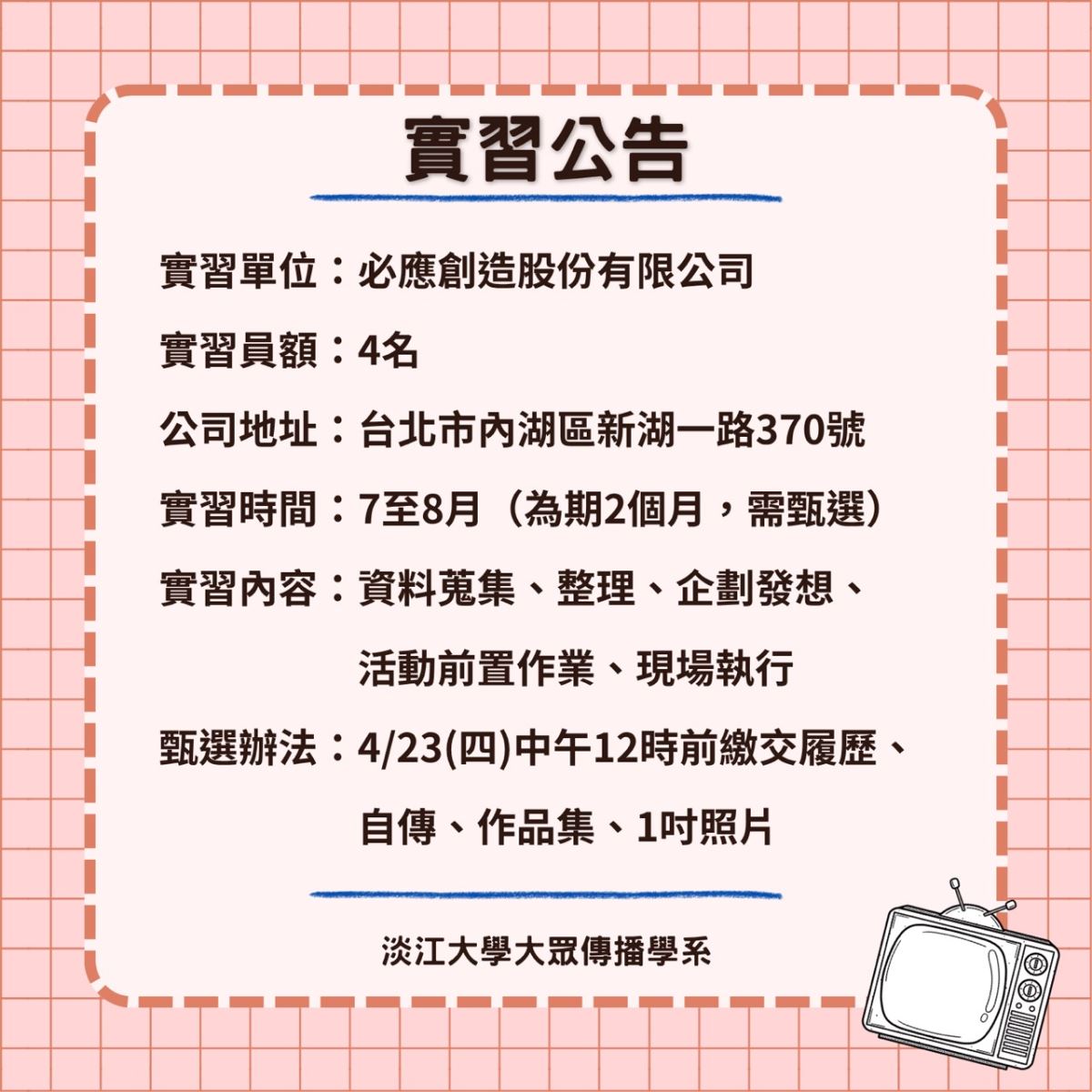 一、實習單位︰必應創造股份有限公司 二、實習員額:4名 三、公司地址:台北市內湖區新湖一路370號 四、實習時間︰7至8月(為期2個月,需甄選) 五、工作時間:依部門規定 六、實習內容:資料蒐集、整理、企劃發想 活動前置作業、現場執行 七、實習生條件: 1.抗壓性夠、對活動執行有熱忱、文書作業系統熟稔 2.能自備筆電尤佳。 3.如有設計系相關實習生,具備設計美感、熟稔 Adobe AI、PS、電腦剪輯等軟體尤佳。 八、甄選辦法:4/23(四)中午12時前,提供履歷、自傳、作品集、1吋照片,並備註期望的部門排序,寄至164702@o365.tku.edu.tw 由助教統一寄出,逾期不候。 九、如有疑問請洽O301/O302偉捷助教。