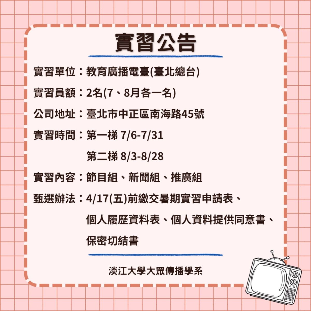 七、實習生條件:對廣播、新聞採編、網路新媒體科技具濃厚興趣之在學學生。